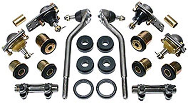 Includes upper & lower ball joints, outer tie rod ends, control arm bushing kit, and lower bump stops.