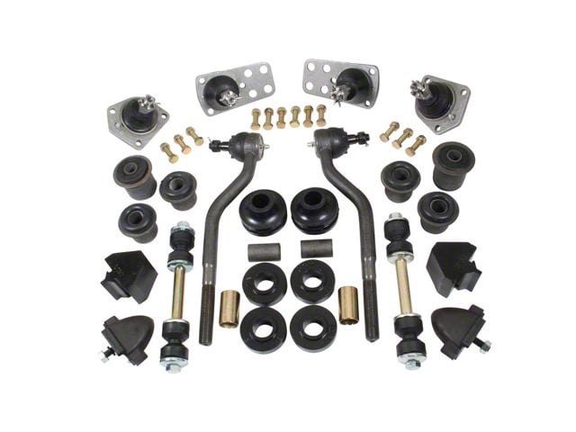 All kits include: upper and lower ball joints, outer tie rod ends, control arm bushings, and strut rod bushings.