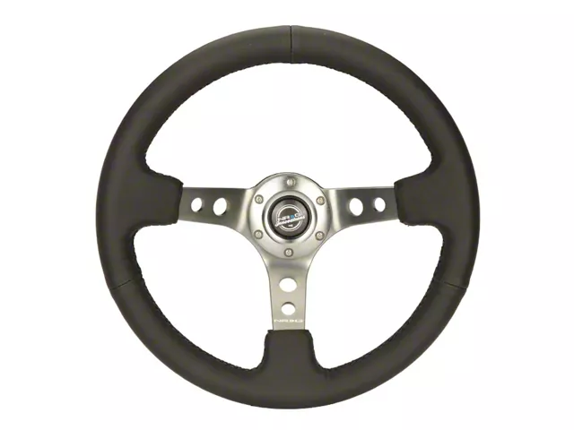 Construction and Appearance. This steering wheel features premium black leather wrapping for comfort and durability, paired with gunmetal-finished spokes that add a bold, modern look. It's compatible with most 6-bolt hub adapters, making it ideal for custom builds or motorsport applications.