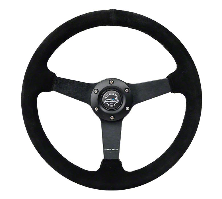 Construction and Appearance. Built for strength and comfort, this steering wheel features a black suede finish that offers superior grip and a premium feel. It’s constructed to be both lightweight and durable, with double-riveted spokes enhancing its structural integrity for demanding driving conditions.