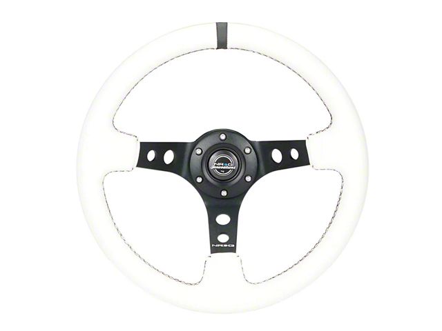 NRG Innovations 350mm 3-Inch Deep Dish Steering Wheel. The NRG Innovations 350mm 3-Inch Deep Dish Steering Wheel is a high-quality performance upgrade designed to enhance the driving experience. This steering wheel features a sleek, stylish design with white leather and black spokes, offering superior grip and a sporty aesthetic. It is perfect for automotive enthusiasts looking to improve both the look and feel of their vehicle's interior.