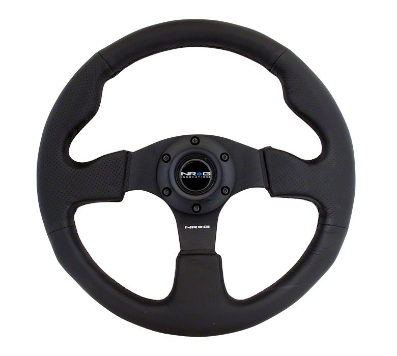 A Touch of Luxury. The NRG Innovations Racing Steering Wheel is wrapped in high-quality black leather, providing a luxurious feel and a comfortable grip. The supple leather enhances the driving experience, offering a premium touch point for the driver.