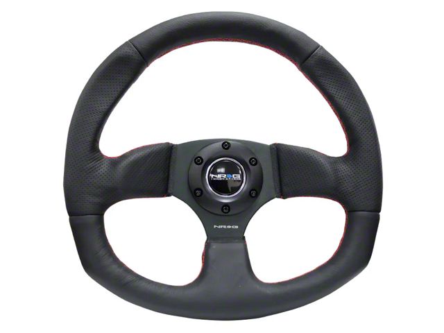 Construction and Appearance. Crafted from lightweight yet reinforced materials, the NRG Innovations Flat Bottom Steering Wheel features double-riveted spokes for increased durability. It’s wrapped in high-quality black leather with contrasting red stitching, providing a sleek, aggressive look that complements any performance interior.