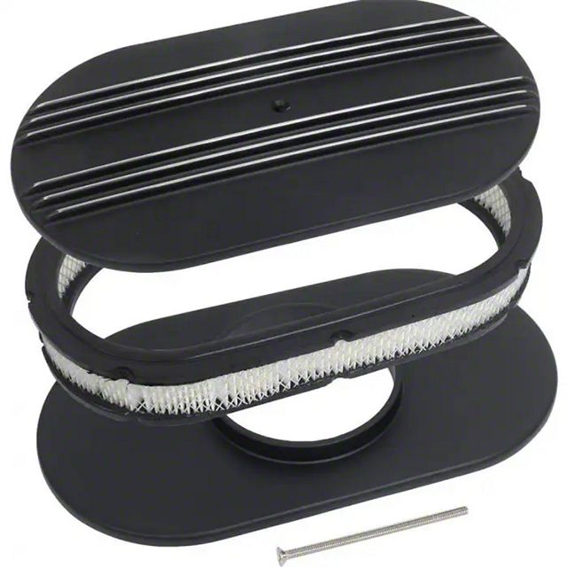 Dress up your classic Ford's engine with this beautiful retro-style partial-finned aluminum 15 inch oval air cleaner from MAC's! It features a black powder-coated, partially-finned top with exposed fin edges for a clean, custom look. This air cleaner will fit most stock and aftermarket carburetors with a 5-1/8" diameter neck like most Carter, Edelbrock, Holley, Rochester, and Quadrajet four barrel carburetors. It also has a raised aluminum base to position the air cleaner above the carburetor flange. Each air cleaner comes with a stainless bolt for mounting. Count on MAC's for all of your classic Ford needs!