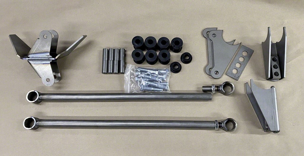 This rear kit has separate brackets for the bars and for the coil-overs. This lets the bars mount outside the frame rails and the coil-overs can mount under or inside the rails for clearance (or vice-versa).Kit includes: Frame brackets 222502 & 222503, Adjusters 100720R (4), Bars 226231 (4), Axle bracket plates 207615 (4 - for 3" axle tubes; 3-1/4" plates are available), Filler plates for the axle bracket plates 27804 (2 - these might have to be trimmed to length), Coil-over brackets 223501 (2), Energy Suspension urethane bushing halves 213091 (16), Urethane bushing inner tubes 18918 (8 - for 1/2" bolts), Bolts (8), Nuts (8).