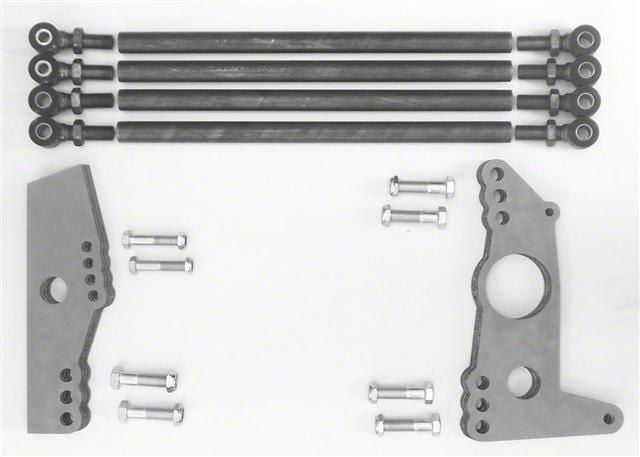 The 1″ diameter DOM bars, with the adjusters installed, have a nominal length of 21″ center-to-center. The brackets are 1/4″ pickled & oiled mild steel. The adjuster bolt holes are 5/8″ except for the front upper holes which are 1/2″. This allows finer upper bar instant center angle adjustment. Heavy-duty, 1-3/4″ wide urethane bushings and inner sleeves are included. The axle brackets have a 1/2″ hole to mount the coil-over and a 3/8″ hole to mount a sway bar.