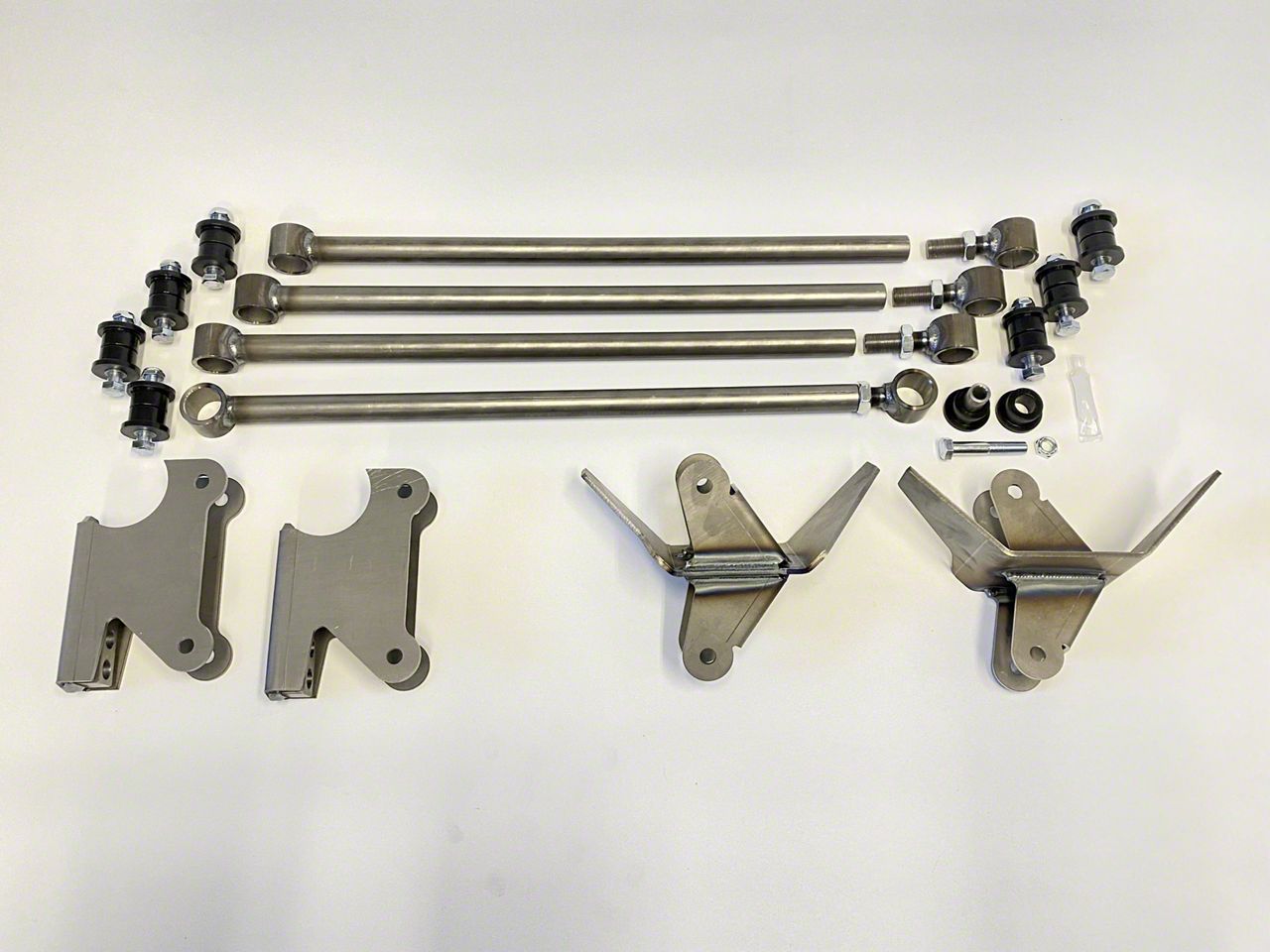 This kit has proven to be adaptable to many frames. The bars mount beside the frame rail (inside the frame or outside, as shown in the pics). The upper bar will be about 3″ above the bottom of the rail. Rear axle brackets have 3 mounting holes for the coil-overs. Bars are about 25” c-c. (4 bars are included in the kit. Custom lengths are available). All brackets are 3/16" mild steel.Please see related products for an adjustable ride height setup tool that can be used in place of your coilovers while you build the car. You can keep your coilovers in perfect condition and make sure you have room for things like exhaust and the driveshaft through suspension travel.Available with axle brackets for 3-1/4" and 2-13/16" tubes. If you have 2-5/8" OD axle bracket tubes, we will supply two pieces of DOM 3" OD x 3/16" wall tubing, 6" long, cut in half lengthwise. These will increase the OD to 3". You can weld these to the axle tubes, then weld the standard 3" axle tubes on.1-3/4″ wide, 1-5/8″ OD urethane bushings3/4-16 threaded adjustersThe brackets are matched to the OD of the bushing for a clean appearance. Brackets and bars are artfully TIG welded.Parts Included: Frame brackets, axle brackets, bars, hardware, bushings, adjusters, and instructions.Instructions: Please click here to see a PDF of the instructions for this kit.Power Train Setup Guide (Inland Empire Driveline)