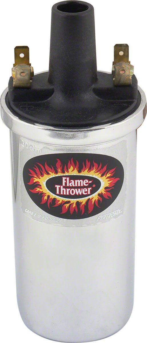 The Flame Thrower is a high-performance 40,000 volt ignition coil. It is the best coil to use with our Pertronix Ignitor breakerless points and condenser replacement.