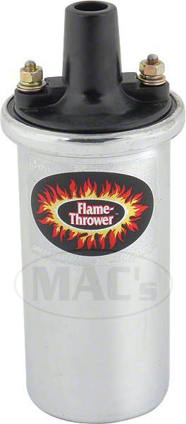 Our 40,000 volt Flame-Thrower chrome coil can benefit virtually any distributor type inductive system. Its higher voltage allows larger spark plug gaps for added power, smoother response and better fuel economy. It is also the perfect coil to go with the PerTronix Ignitor breakerless ignition. These coils are internally resisted so installation and wiring is drastically simplified. Oil filled coils offer great heat control for street driven vehicles.