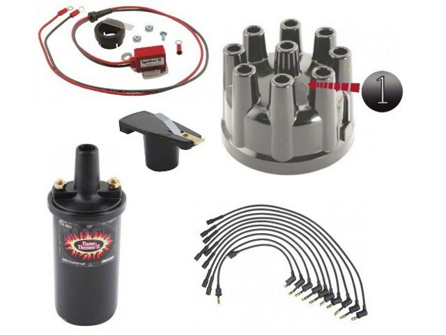 This is a great kit which is appropriate for most Ford V8 engines made between 1957-1974. The most significant component included is the Pertronix Ignitor II point eliminator. You can take performance one-step higher with the Ignitor II. The dwell is constantly monitored by a new microcontroller and adjustments are made to maintain peak efficiency throughout the entire RPM range. Best of all you never have to replace points again while maintaing a stock look. Next is a low-resistance (0.6 ohm) Pertronix Flame Thrower II coil. The Ignitor II needs a coil with this resistance, and the Flame Thrower II produces up to 45,000 volts for a powerful, clean spark. Since it is black, the sticker can be removed for stock looking engine compartments. T
