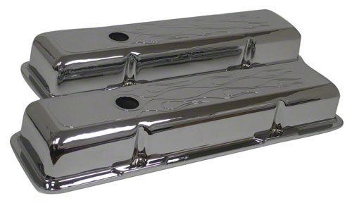 Polished Aluminum Small Block 283-400 Short Valve Covers, Flamed (62-68 Chevy II; 69-79 Nova)