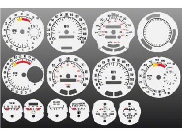 White Face Overlays Included In This Kit: 160 MPH Speedometer,100 MPH Speedometer,85 MPH Speedometer,8000 RPM Tachometer,6000 RPM Tachometer x2,Volts Gauge,Oil Pressure Gauge,Clock Gauge,Small Fuel Gauge,Blank Gauge, Oil Pressure Gauge,Temperature Gauge
