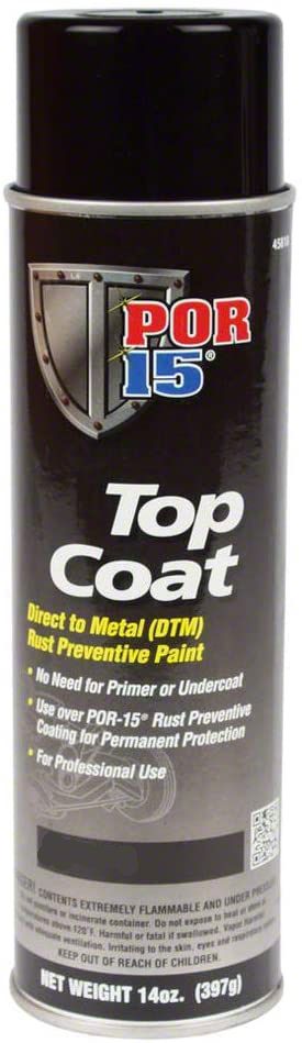 POR-15 Top Coat aerosol is a direct-to-metal (DTM) paint designed to work incredibly well in all applications where there is a need to help preserve substrates susceptible to corrosion. Under exterior exposure POR-15 Top Coat has exceptional long-term sheen and color retention. POR-15 Top Coat can be applied directly to metal substrates or previously painted surfaces, with no need for a primer or undercoat, and is formulated to form a robust barrier that sheds moisture to provide long-lasting protection. POR-15 Top Coat provides excellent adhesion and when used over POR-15 Rust Preventive Coating, works to provide a permanent barrier to corrosion.