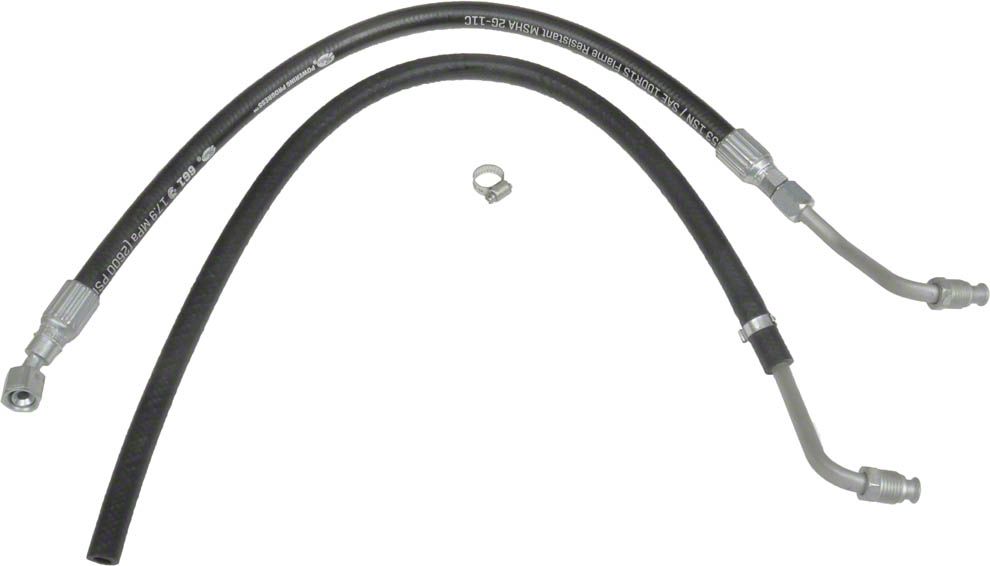 2 Piece OEM style rubber power steering hose kit. Connects Ford power steering pump to Borgeson Mustang power conversion box.