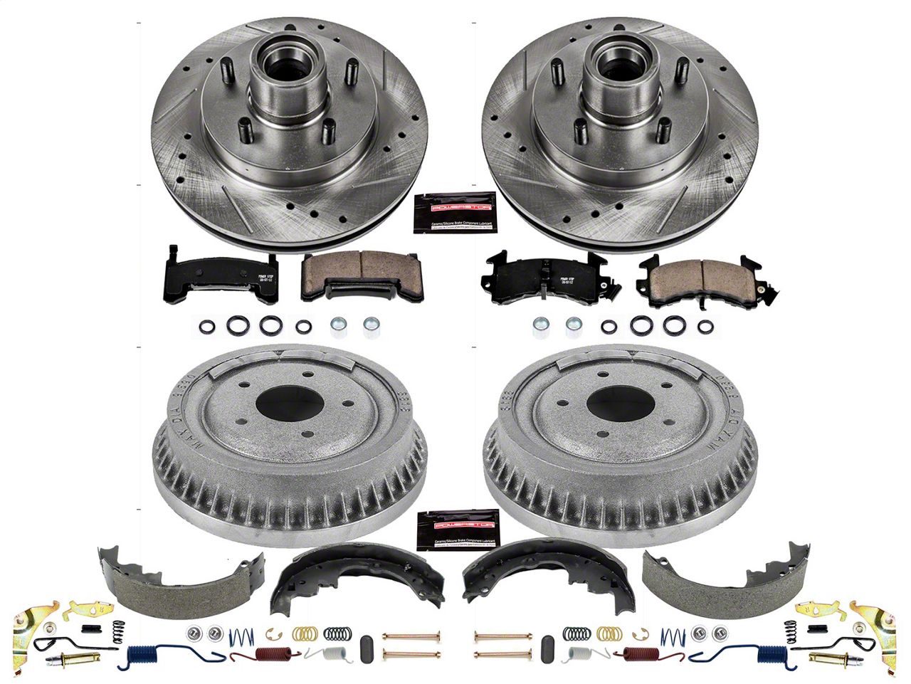 PowerStop is on a mission to deliver an easy way for any driver to upgrade their brakes - no matter where or how they use their vehicle. Forget standard, off-the-shelf parts. Our Z23 Evolution Sport Brake Drum Upgrade Kit comes with everything you need, from pads, two rotors, a set of brake drums and brake shoes, plus the hardware necessary for an easy, bolt-on upgrade for your daily-driver. Along with increased braking power, the Carbon-Fiber Ceramic brake pads feature a low-dust formula to keep those wheels looking great while you say goodbye to nasty brake dust. These pads combine with Drilled & Slotted rotors to ensure a cool, smooth ride that protects against rust and corrosion. The Evolution premium coated brake drums come with brake shoes, a spring/hold-down kit and adjusters. Give your daily-driver the easy and affordable performance upgrade it deserves with the Z23 Evolution Sport Brake Drum Upgrade Kit.