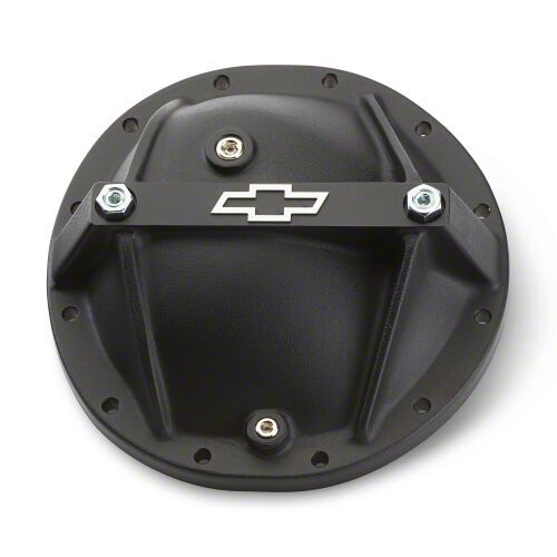 Reinforced lightweight aluminum rear end cover designed to strengthen the rear housing case in heavy torque situations. The familiar Bowtie Emblem is raised and precision milled on a black crinkle coated surface. Each cover includes two bolts to stabilize bearing main caps, a fluid capacity plug, a magnetic drain plug, and Grade 8 mounting bolts. Exterior of the cover has a black crinkle finish.