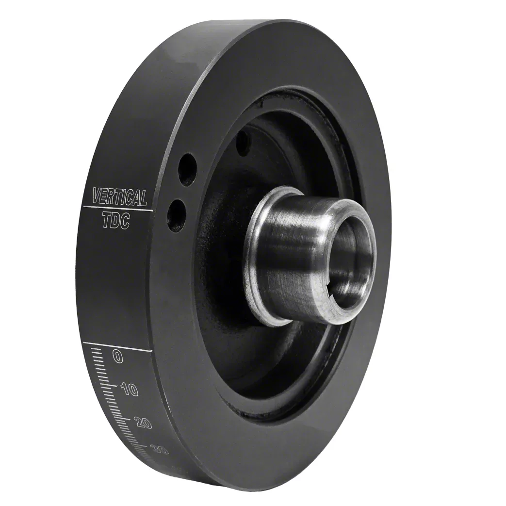 Construction and Appearance. Constructed from nodular iron, this damper incorporates a splined hub and outer ring to eliminate radial movement and deliver greater strength and reliability. It is finished in black and features laser etched timing marks for easy reference during engine tuning and maintenance.