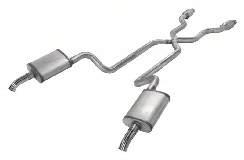 Construction and Features. Constructed from 16-gauge 409 stainless steel tubing, this system ensures exceptional durability and resistance to corrosion. The included X-pipe enhances exhaust flow for better performance, while the catalytic converters and 304 stainless steel polished chrome tips add a touch of style and efficiency. The raw metal finish provides a classic and rugged appearance.