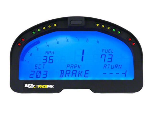 Racepak IQ3 data recorders represent an entirely new concept in data logging dashes. By placing the 32-channel data logger, 512 MB memory card, GPS board, and 3-axis G-meter inside the dash, every feature of the data system is now located in one central location. This means that only one small cable will transmit the data from all the sensors to the rear of the dash. This eliminates the need for a sensor harness, greatly reducing installation time, complexity and overall weight. The programmable shift lights are protected from sunlight by a molded shield above the lights, while the low-glare LCD display is well recessed in the housing to provide viewing in all light conditions. The rear of the dash contains the connectors for the external GPS antenna and V-Net sensor cable—plus the