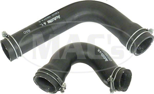 Each set consists of upper and lower radiator hose with logo and correct numbers. Also has double-wire type clamps stapled to each end - as original.