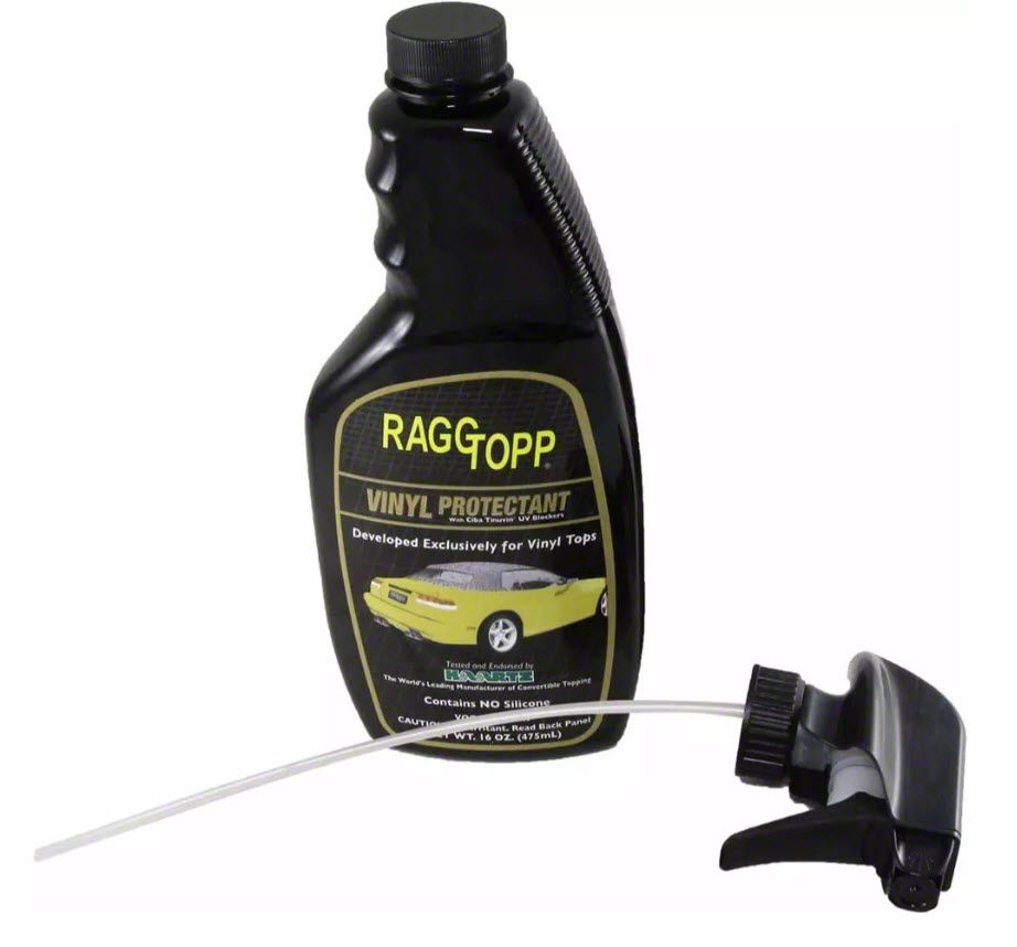Eckler's now offers Vinyl Protectant for both inside and outside of your Classic Car from RaggTop. This great product contains NO Silicone oil, so no worries regarding your paint surface. RaggTopps Vinyl Protectant does contact Ultraviolet (UV) Absorbers and Blockers. Will not streak, easy to apply, spray on/Wipe off. You'll be glad you choose one of the fine products from RaggTopp.