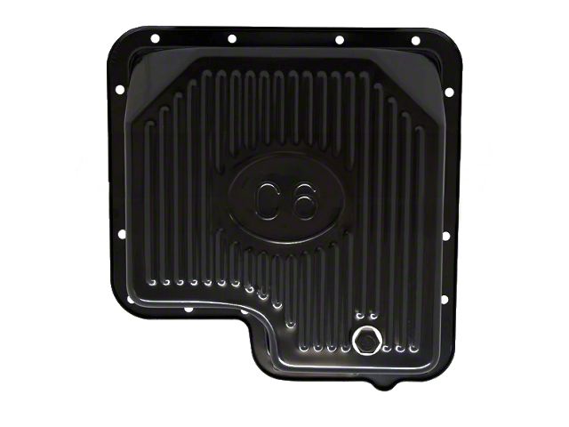 Ford C6 EDP BLACK steel transmission pan. Features a stamped C6 logo and comes with drain plug. Stock capacity. Depth: 2-3/8".