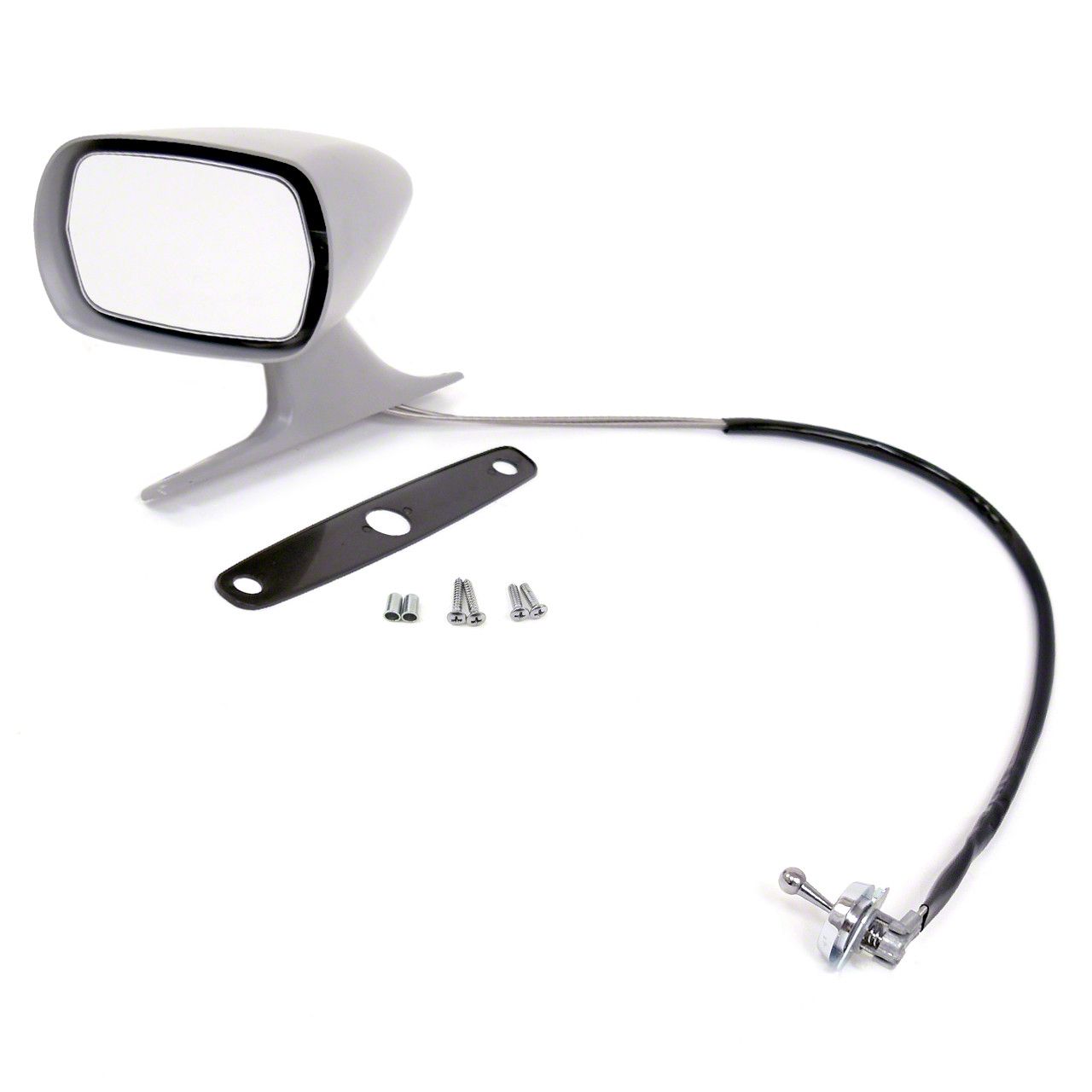 Includes Racing-type housing, mirror head/base assembly with adjuster cables, door mount gasket, and attachment hardware