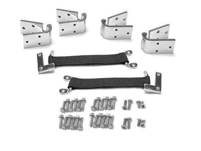 Includes 4 removable style door hinges, 2 quick release door check brackets, 2 nylon web straps with stainless steel anchors and the necessary hardware.