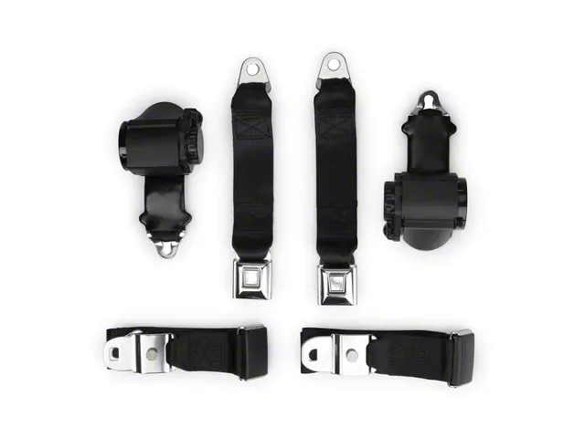 Reliable Seat Belt Upgrade. The RetroBelt Retractable Shoulder Push-Button Bucket Seat Belt Kit with Single Retractors provides a modern safety upgrade while preserving a classic aesthetic. Designed with an advanced inertia reel retractor system, this kit ensures secure and comfortable restraint, enhancing safety and usability for vintage vehicles.