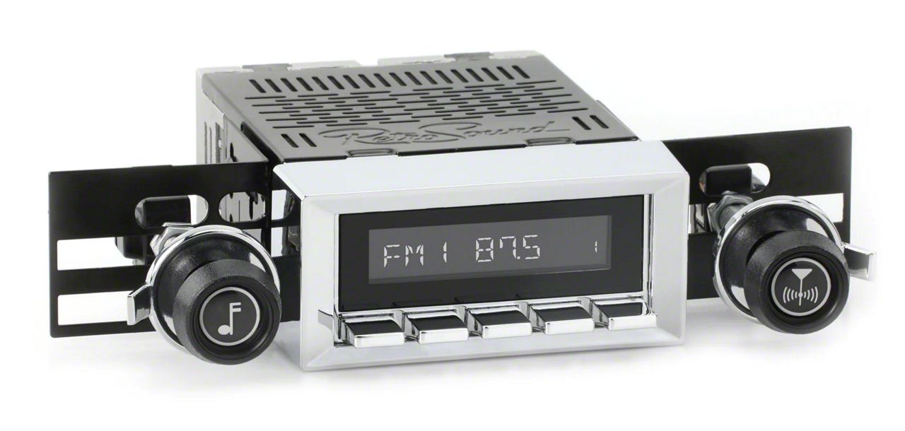 Classic Meets Modern. The RetroSound RetroRadio Motor 1 Radio is the ideal upgrade for Corvette enthusiasts looking to combine classic styling with modern technology. Designed to mimic the original factory look, this unit features a polished chrome finish, push buttons, and a period-correct installation bezel and knobs. While it retains a vintage aesthetic, the radio packs modern capabilities like Bluetooth connectivity and a powerful 275-watt Mosfet amplifier for excellent audio quality.