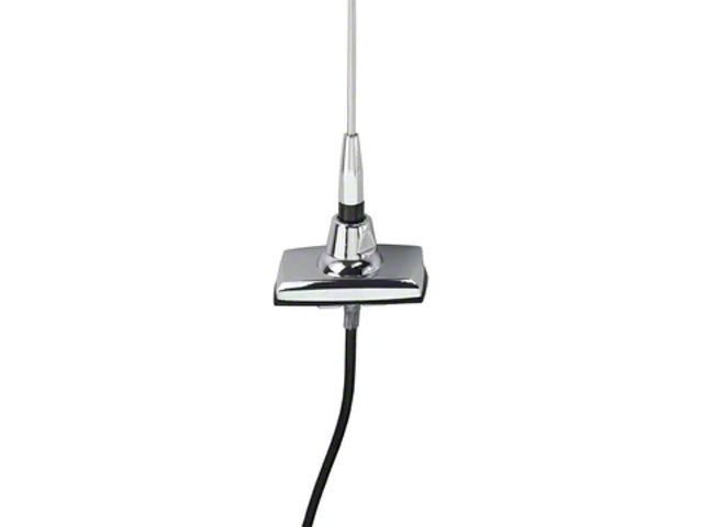 This is a 1961-79 Ford F-Series Trucks replacement antenna with a rectangular base and semi-collapsible or fixed mast. It uses all metal mounting parts and a rugged stainless mast. Antenna cable is included.