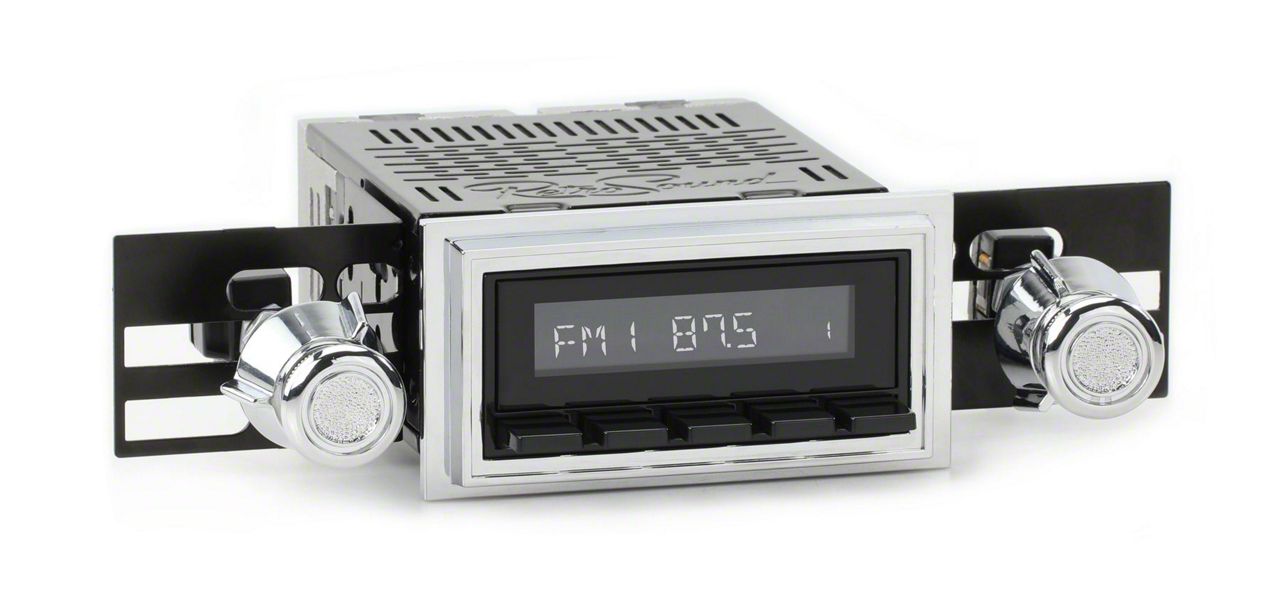 RetroSound RetroRadio Motor 1 Radio with Black Face, Chrome Bezel, Chrome Metal Knobs and Late Ford Logo Vintage Overlay (68-79 F-100, F-150, F-250, F-350)