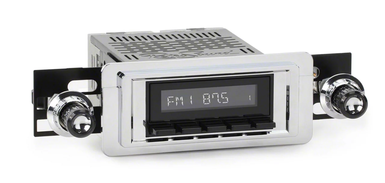 For a factory-like fit, RetroRadio includes RetroSound’s patented InfiniMount™ Brackets that can be adjusted during installation to achieve the proper width and depth of control shafts and a flush fitment of the Radio Face.