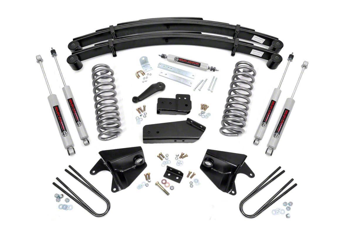 Give your 80-96 Ford Bronco an aggressive look from front to rear with Rough CountryΓÇÖs 4" Ford Suspension Lift Kit! This easy-to-install leveling kit raises the front of your vehicle to be equal height with the rear for a leveled, flush look that gives a better ride height and more aggressive appearance. This kit features a set of front, durable coil springs and rear leaf springs allowing you gain additional ride height without sacrificing ride quality or performance. A set of radius arm and I-Beam drop brackets are provided to keep everything at optimum angles for a factory-like ride, even after lifting. Our fabricated rear blocks offer considerably more strength than their cast iron counterparts. A set of Rough Country's premium N3 shocks are also included in this kit. These fine tuned 10-stage variable high-pressure Nitrogen charged shocks offer a fantastic blend of off-road action and smooth highway ride quality. With a durable 18mm spring-loaded piston rod and faster-cooling 54mm shock body. Get the wheels you want! Rough Country's 4" Ford Suspension Lift Kit comes with everything you need to fit up to a 33x12.5" tire with proper wheel backspacing. Best of all, Rough Country's 4" Ford Suspension Lift Kit is backed by our Lifetime Replacement Warranty.