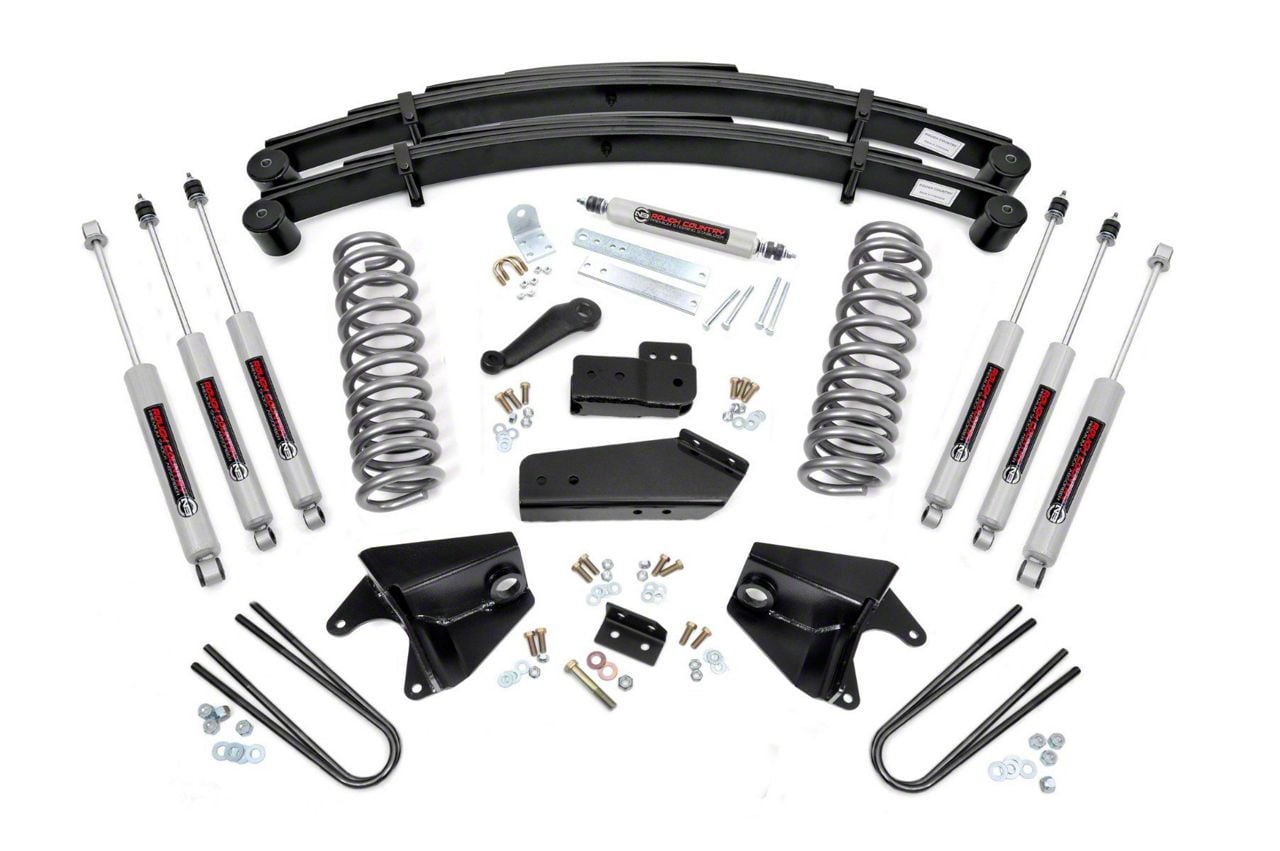 Superior Lift. Give your Ford F-150 an aggressive look from front to rear with Rough Country’s 4" Ford Suspension Lift Kit! This easy-to-install suspension kit raises the front of your vehicle to be equal height with the rear for a leveled, flush look that gives a better ride height and a more aggressive appearance.\Durable Components. This kit features a set of front, durable coil springs allowing you gain additional ride height without sacrificing ride quality or performance. A set of radius arm and axle drop brackets are provided to keep everything at optimum angles for a factory-like ride, even after lifting. A set of Rough Country's premium N3 shocks are also in this kit. These fine-tuned 10-stage variable high-pressure Nitrogen charged shocks offer a fantastic blend of off-road action and smooth highway ride quality. With a durable 18mm spring-loaded piston rod and faster-cooling 54mm shock body.\Installation. Rough Country’s 4-inch kit features an easy installation process with only light drilling required for an easy, no-fuss assembly and takes approximately 6-8 hours to complete.\Limited Lifetime Replacement Warranty. Rough Country's 4" Suspension Lift Kit is backed with a limited lifetime replacement warranty towards manufacturer defects. As such, the product is protected from structural and workmanship damage after the date of purchase. With our industry-leading warranty give yourself peace of mind when using Rough Country's Suspension products!