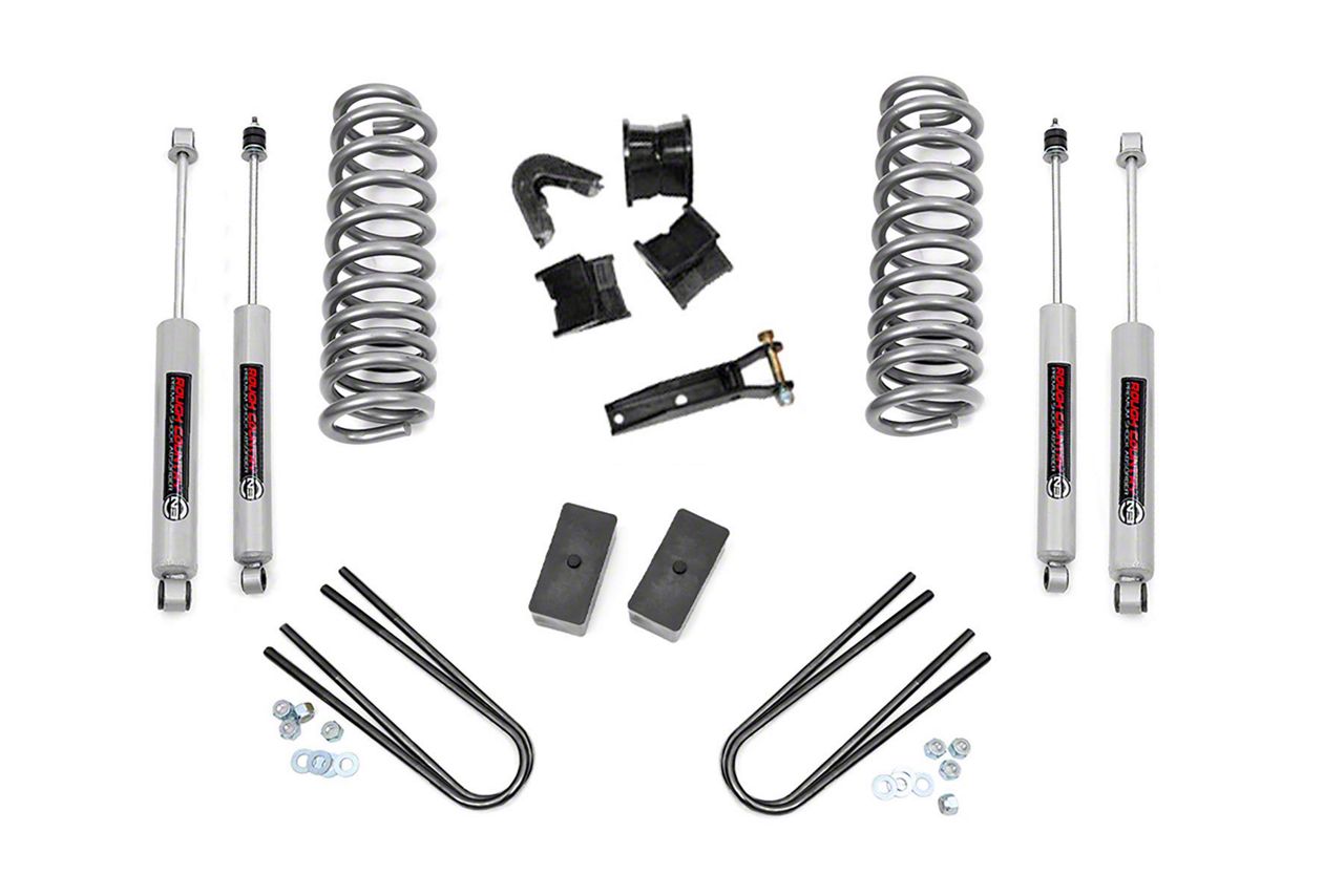 Give your Ford an aggressive look from front to rear with Rough CountryΓÇÖs 4" Ford Suspension Lift Kit! This easy-to-install leveling kit raises the front of your vehicle to be equal height with the rear for a leveled, flush look that gives a better ride height and more aggressive appearance. This kit features a set of front, durable coil springs allowing you gain additional ride height without sacrificing ride quality or performance. A set of 7 degree c-bushings and track bar drop bracket are provided to keep everything at optimum angles for a factory-like ride, even after lifting. A set of Rough Country's premium N3 shocks are also included in this kit. These fine tuned 10-stage variable high-pressure Nitrogen charged shocks offer a fantastic blend of off-road action and smooth highway ride quality. With a durable 18mm spring-loaded piston rod and faster-cooling 54mm shock body. Get the wheels you want! Rough Country's 4" Ford Suspension Lift Kit comes with everything you need to fit up to a 35" tire with proper wheel backspacing. Best of all, Rough Country's 4" Ford Suspension Lift Kit is backed by our Lifetime Replacement Warranty.