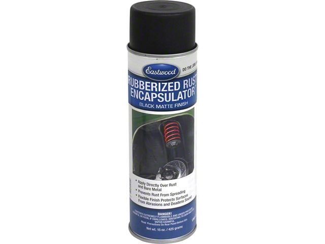Unlike off-the-shelf under coatings, Rubberized Rust Encapsulator can be applied directly over rust and without the bubbling that creates air pockets thus trapping rust. Since it is engineered with high-tech flex agents, its pliable finish protects surfaces from abrasions, road hazards and deadens sound. So durable it exceeded 1,000 hours of salt spray chamber testing, this surpasses the standards for a 2-component catalyzed coating! Simply apply directly over rust or bare metal; no need to topcoat. Remains flexible and durable. Satin black finish. Application: Use a wire brush to remove loose rust, scale and paint, and remove dust, grease and oil deposits. Feather surrounding paint with 220-grit sandpaper. Shake can for at least 2 minutes once the mixing ball starts to rattle. Hold the