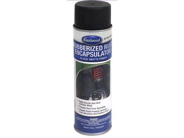 Unlike off-the-shelf under coatings, Rubberized Rust Encapsulator can be applied directly over rust and without the bubbling that creates air pockets thus trapping rust. Since it is engineered with high-tech flex agents, its pliable finish protects surfaces from abrasions, road hazards and deadens sound. So durable it exceeded 1,000 hours of salt spray chamber testing, this surpasses the standards for a 2-component catalyzed coating! Simply apply directly over rust or bare metal; no need to topcoat. Remains flexible and durable. Satin black finish. Application: Use a wire brush to remove loose rust, scale and paint, and remove dust, grease and oil deposits. Feather surrounding paint with 220-grit sandpaper. Shake can for at least 2 minutes once the mixing ball starts to rattle. Hold the