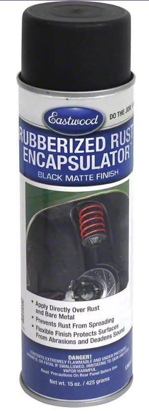 Unlike off-the-shelf under coatings, Rubberized Rust Encapsulator can be applied directly over rust and without the bubbling that creates air pockets thus trapping rust. Since it is engineered with high-tech flex agents, its pliable finish protects surfaces from abrasions, road hazards and deadens sound. So durable it exceeded 1,000 hours of salt spray chamber testing, this surpasses the standards for a 2-component catalyzed coating! Simply apply directly over rust or bare metal; no need to topcoat. Remains flexible and durable. Satin black finish. Application: Use a wire brush to remove loose rust, scale and paint, and remove dust, grease and oil deposits. Feather surrounding paint with 220-grit sandpaper. Shake can for at least 2 minutes once the mixing ball starts to rattle. Hold the