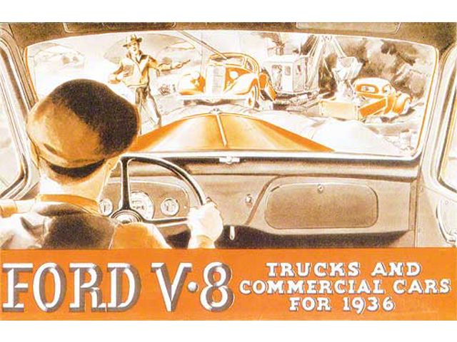 This is a reprint of an original dealer sales brochure that showcases the full line of 1936 Ford Trucks and Commercial Cars powered by the Flathead V8.