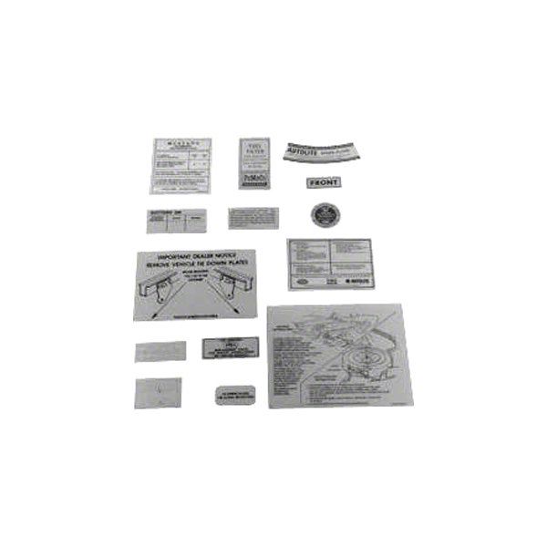 Great Detailing Aid. These Kit includes Battery test OK, service specification, Autolite spark plug air cleaner, oil filler cap, coil decal, glove box tire psi, jacking instruction, rear gravel pan, voltage regulator, power disc. brake master cylinder, jack decal, air cleaner service instruction, air cleaner front, and air cleaner part number decals. Air cleaner & air conditioning decal are not included.