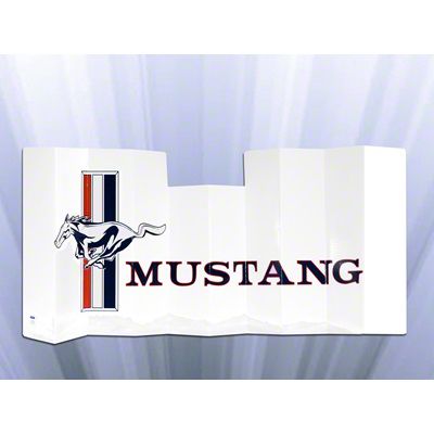 Keep your cabin cool while protecting your Ford Mustang's interior from harsh heat and UV rays with Scott Drake's new fade-resistant windshield sunshade. Officially Licensed by Ford, this accordion-style sunshade features the classic Tri-Bar and script logo that spans the width of the Sun Shade and is made out of heavy-duty bright white glossy cardboard. Folds flat for easy storing when not in use. The reverse side features the Drake Automotive Group logo.