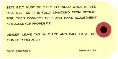 Seat Belt Retractor Instruction Tag - Fairlane
