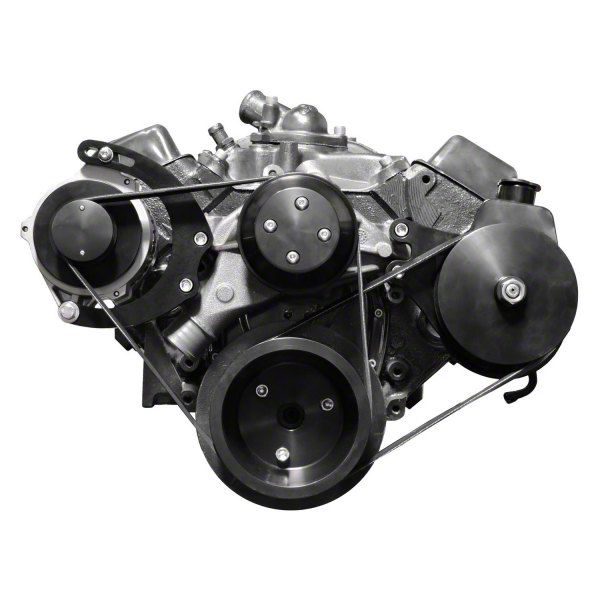 All American Billet Serpentine Conversion Kits are a great way to upgrade your front drive accessories and clean up your engine. Our kits convert V-belt pulleys to the modern 6-rib serpentine belts. They mount through the water pump for easy installation and are easily adjusted. Kits are designed for the long water pump and include alternator bracket (fits GM alternators with 6 o’clock and 12 o’clock mounting, 6.6” diameter, not included), Saginaw Style power steering pump (on PS kits, not included), pulleys (alternator fan pulley with cover, water pump pulley, crank pulley, and PS pulley (if PS kit)), spacers, belts and hardware). Available in machined finish, black anodized and Pol