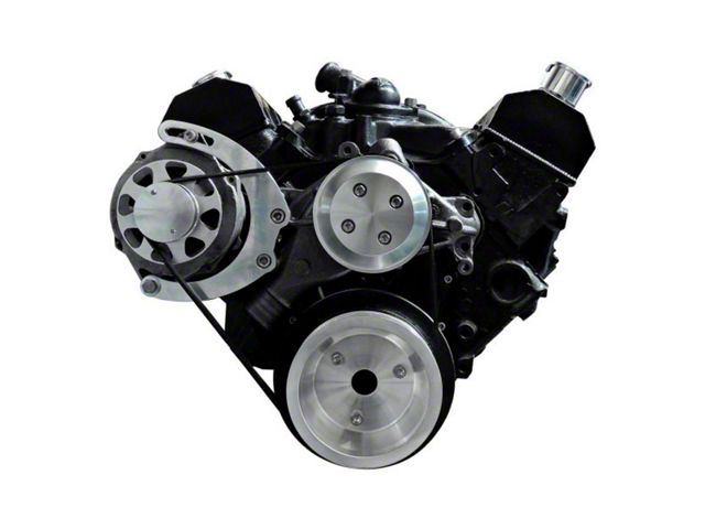 All American Billet Serpentine Conversion Kits are a great way to upgrade your front drive accessories and clean up your engine. Our kits convert V-belt pulleys to the modern 6-rib serpentine belts. They mount through the water pump for easy installation and are easily adjusted. Kits are designed for the long water pump and include alternator bracket (fits GM alternators with 6 o’clock and 12 o’clock mounting, 6.6” diameter, not included), Saginaw Style power steering pump (on PS kits, not included), pulleys (alternator fan pulley with cover, water pump pulley, crank pulley, and PS pulley (if PS kit)), spacers, belts and hardware). Available in machined finish, black anodized and Pol