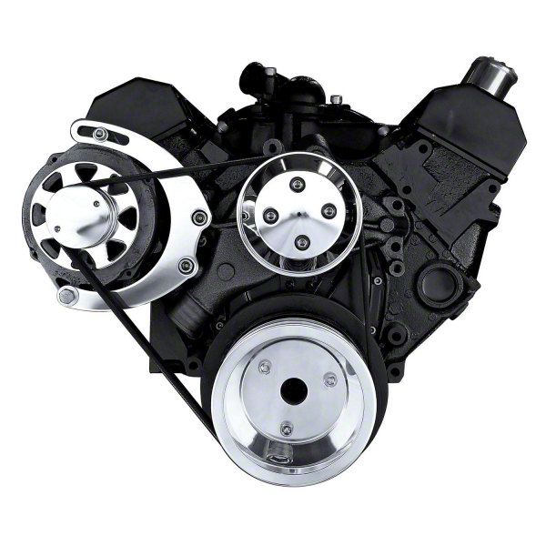 All American Billet Serpentine Conversion Kits are a great way to upgrade your front drive accessories and clean up your engine. Our kits convert V-belt pulleys to the modern 6-rib serpentine belts. They mount through the water pump for easy installation and are easily adjusted. Kits are designed for the long water pump and include alternator bracket (fits GM alternators with 6 o’clock and 12 o’clock mounting, 6.6” diameter, not included), Saginaw Style power steering pump (on PS kits, not included), pulleys (alternator fan pulley with cover, water pump pulley, crank pulley, and PS pulley (if PS kit)), spacers, belts and hardware). Available in machined finish, black anodized and Pol