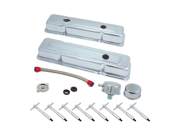 Construction and Appearance. Built from high-quality materials, the kit includes chrome valve covers with a stock height baffled design. The durable chrome finish provides long-lasting shine and corrosion resistance, making it both functional and stylish. Engineered to OE specifications, the covers ensure proper fitment and performance.