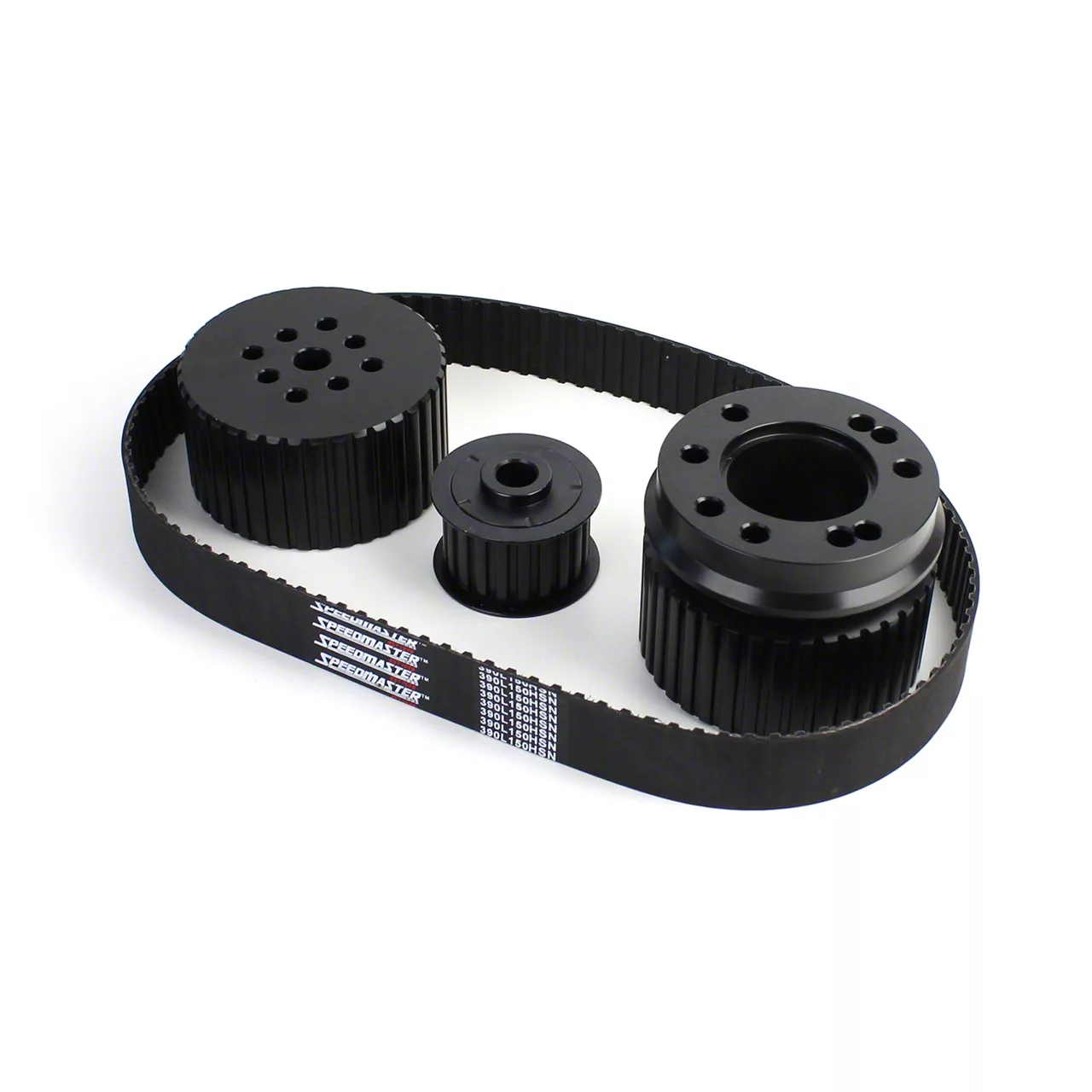 Speedmaster gilmer drive kits are aluminum machined and precision-made for your street/race engines. They eliminate belt-throwing problems. Speedmaster gilmer drive belts are designed to keep your accessory drive operating properly, providing higher power and torque transmission, improved meshing to reduce tooth jump, greater resistance to tooth shear, and reduced friction to extend belt life. The belts use a fiberglass cord wound across the entire width to minimize stretching. Manufactured from a synthetic neoprene compound resistant to heat, oils, ozone, and aging, with tough nylon fabric bonded to the tooth surface for greater wear resistance.