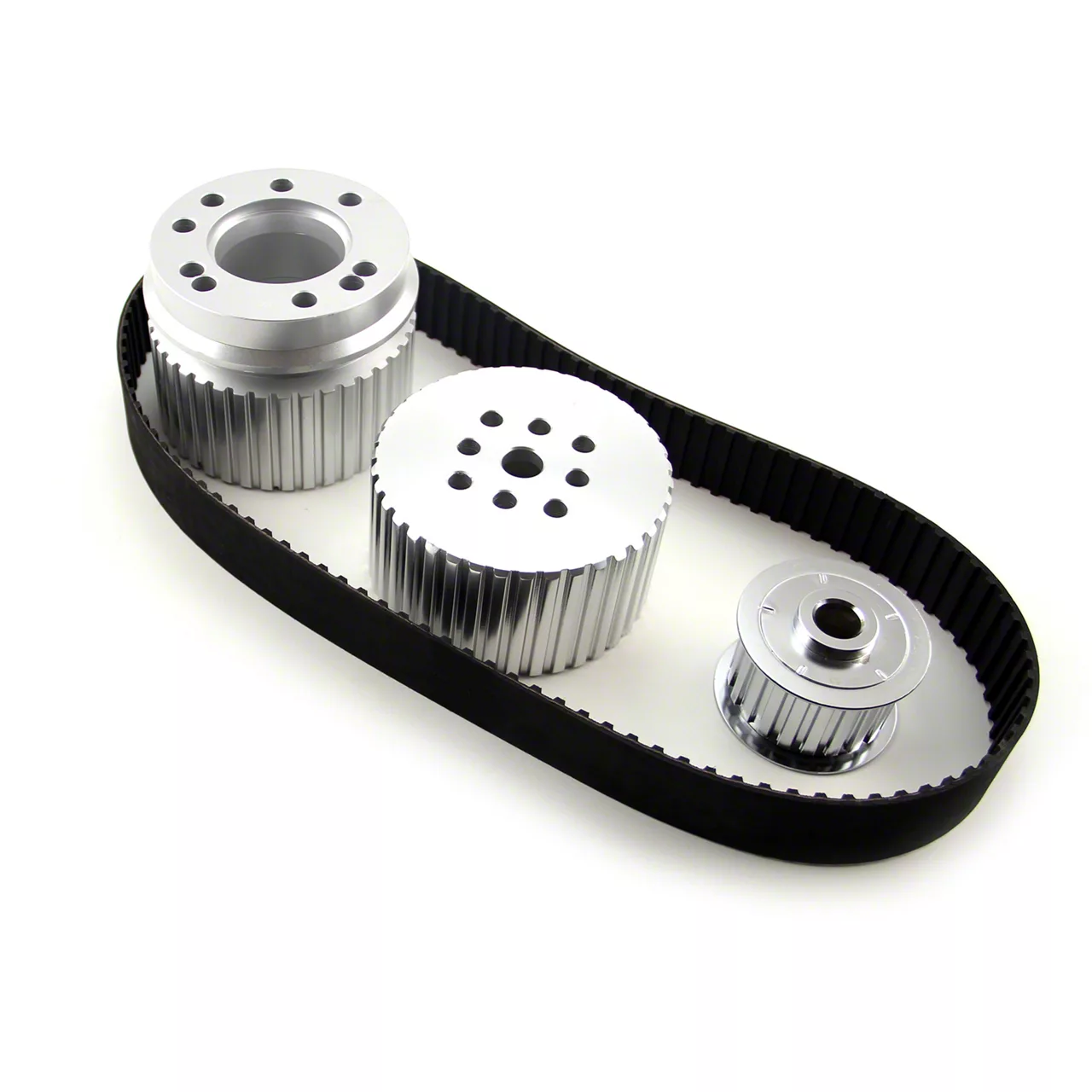 Speedmaster gilmer drive kits are aluminum machined and precision-made for street and race engines. They eliminate belt-throwing issues and ensure your accessory drive operates properly. The belts deliver higher power and torque transmission, improved meshing to reduce tooth jump, greater resistance to tooth shear, and reduced friction to extend service life. Fiberglass cords across the belt width minimize stretching, and synthetic neoprene construction resists heat, oils, ozone, and aging. Tough nylon fabric bonded to the tooth surface enhances wear resistance.