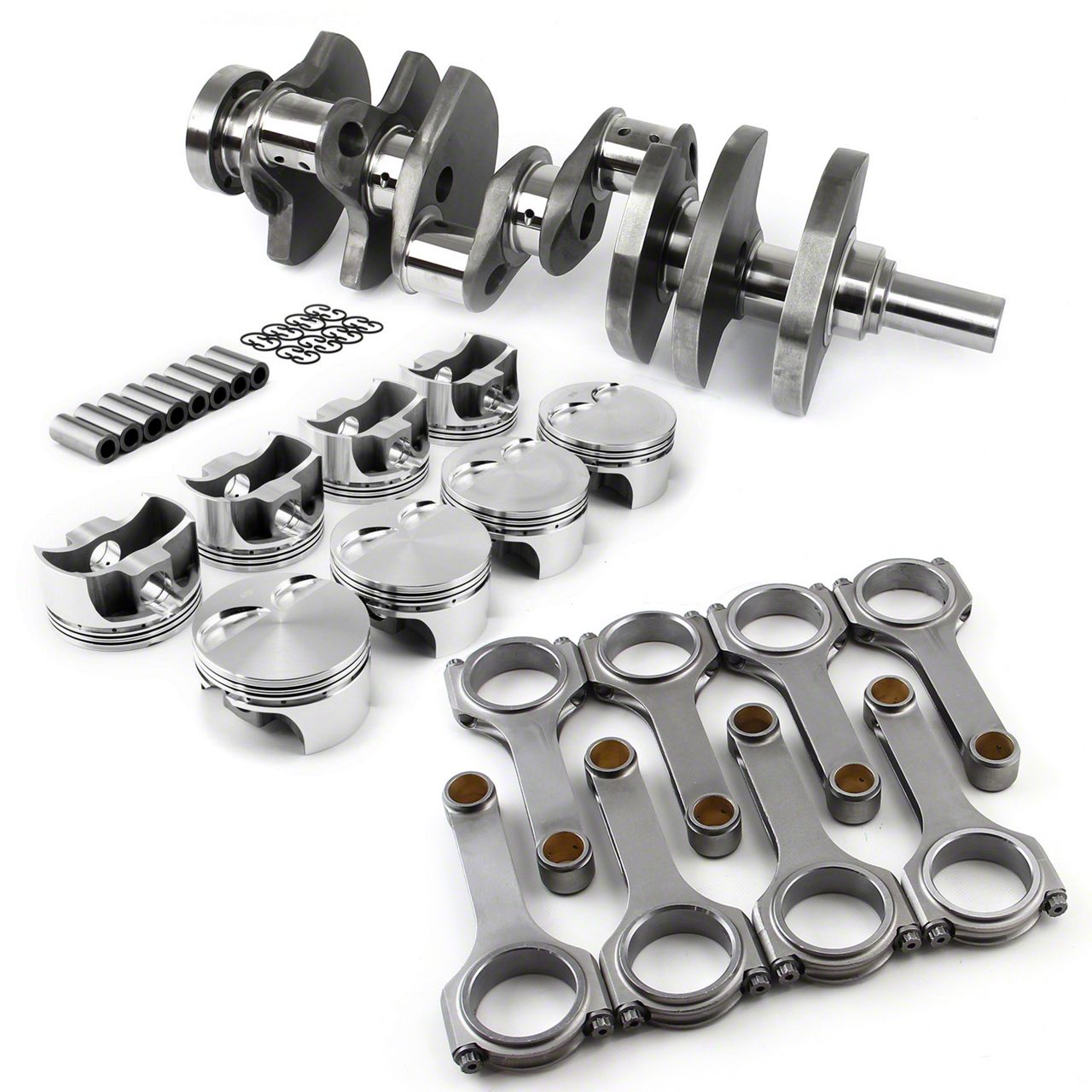 Brand: SpeedmasterPart Number: PCE290.1155Part Type: Engine Rotating KitActual Engine CID: 403Bore (in): 4.005 in.Engine Stroke (in): 4.000 in.Balanced: NoPistons Included: YesPiston Rings Included: NoPiston and Ring Oversize (in): 0.030 in.Piston Material: ForgedPiston Style: Flat top, with two valve reliefsPiston Head Volume (cc): -4.00ccWrist Pin Style: Press-fit or floatingPiston Ring Facing Material: N/ACrankshaft Included: YesCrankshaft Material: ForgedRear Main Seal Style: 1-pieceEngine Balance: InternalConnecting Rods Included: YesConnecting Rod Material: 4340 Chromoly SteelConnecting Rod Beam Style: H-beam Street/StripConnecting Rod Length Center to Center (in): 6.125 in.Rod Bearings Included: NoRod Bearing Undersize (in): StockMain Bearings Included: NoCam Bearings Included: NoGaskets Included: NoQuantity: Sold as a kit.DescriptionCrankshaftSpeedmaster forged standard weight crankshafts are designed for street or race engines with substantially increased horsepower. Speedmaster crankshafts are precision-ground, heat-treated, shot-peened, inspected and micro-polished for superior tolerance control. Speedmaster crankshafts are also nitride-hardened for superior wear resistance, have straight-shot and chamfered oil holes, and feature lightening holes in all rod throws. These crankshafts also have a large radius on all journals for improved strength and wear resistance.Connecting RodsSpeedmaster H-beam connecting rods are one of the strongest connecting rods available. Speedmaster H-beam connecting rods are perfect for supercharged and nitrous applications. These rods incorporate a special dowelled cap for specific cap-to-rod alignment and are profiled with extra clearance for stroker applications.Speedmaster H Beam Street / Strip connecting rods are manufactured from aircraft quality 4340 chromoly steel. The rods are x-rayed and ultrasonically tested with all surfaces shot peened and stress relieved.PistonsSpeedmaster Forged pistons are made from 4032 aluminum alloy for quieter operation and reduced piston to wall clearance. Up to 20% lighter than traditional forged pistons that eliminate harmful stress concentrations for superior strength. Specifically designed for naturally aspirated or moderate nitrous applications.